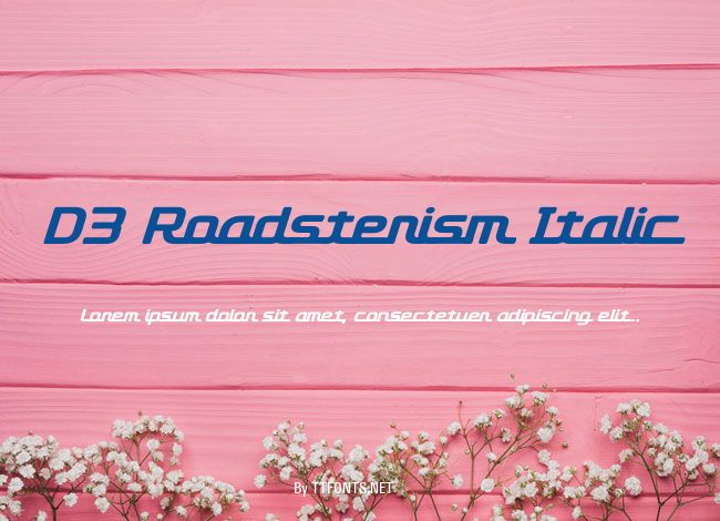 Esta es la página del tipo de letra D3 Roadsterism Italic. Puede descargarlo de forma gratuita y sin registro aquí. Esta entrada fue publicada en Friday, 02 September 2011 y colocada en el catálogo de Regular. La versión de D3 Roadsterism Italic es 1.0. Esta página ha sido vista por 237 times. El archivo fue descargado 858 veces.