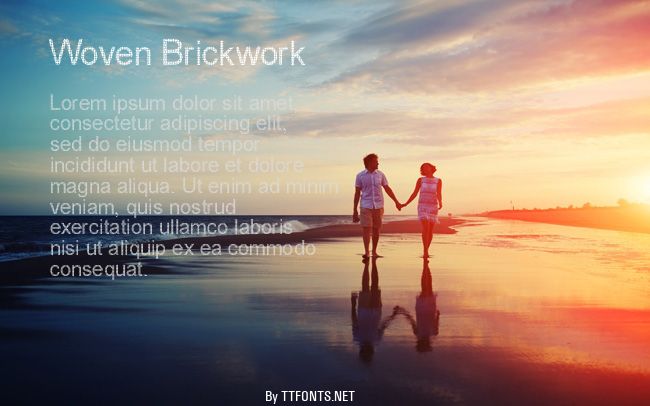 Esta es la página del tipo de letra Woven Brickwork. Puede descargarlo de forma gratuita y sin registro aquí. Esta entrada fue publicada en Tuesday, 20 March 2012 y colocada en el catálogo de Regular. La versión de Woven Brickwork es 1. Esta página ha sido vista por 249 times. El archivo fue descargado 773 veces.